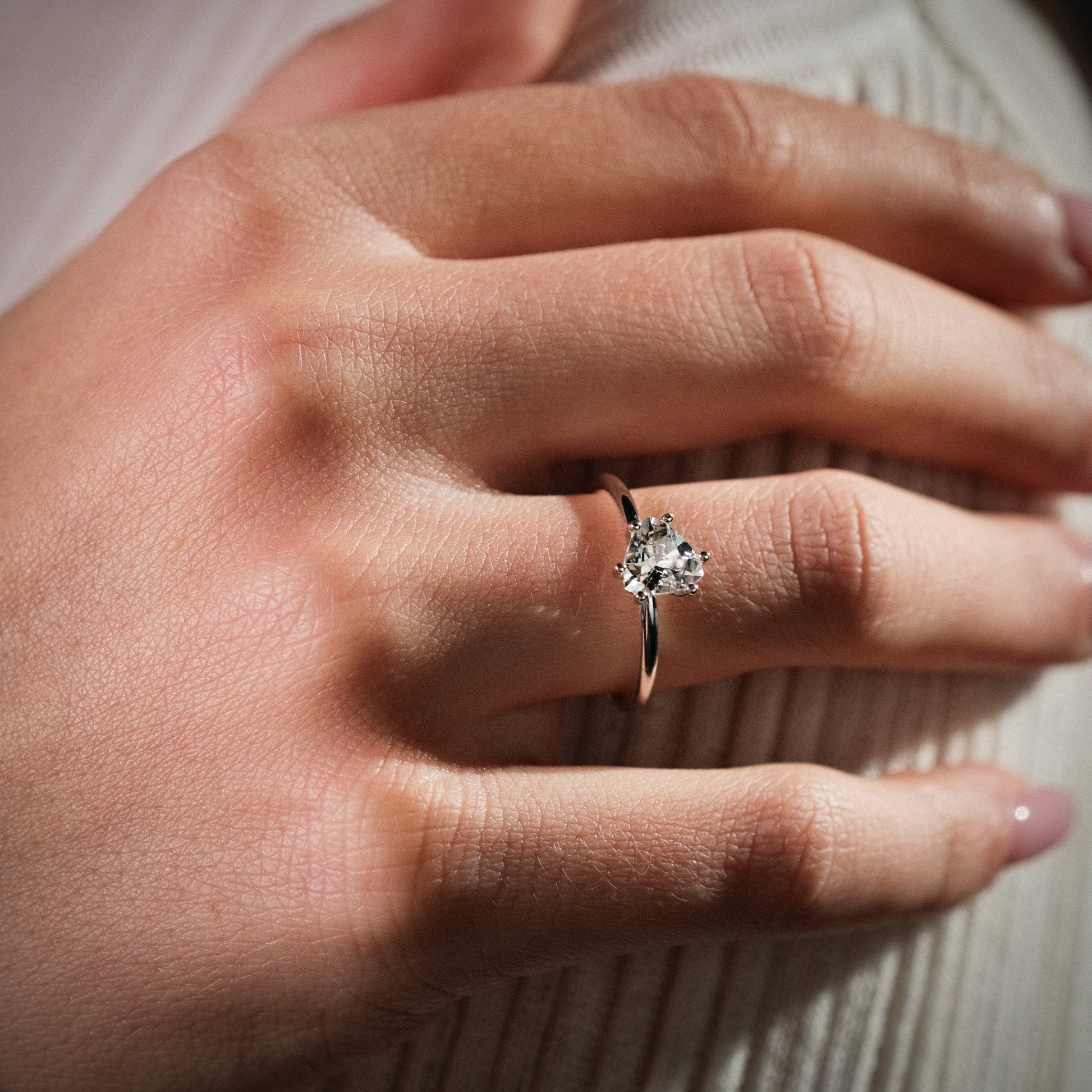 Der Solitär-Ring ist mittig mit einem Diamant oder Farbedelstein besetzt. Der Steinbesatz wird in Form von sechs Krappen gehalten und kann optional von 0.15 ct bis 3.0 ct gewählt werden.